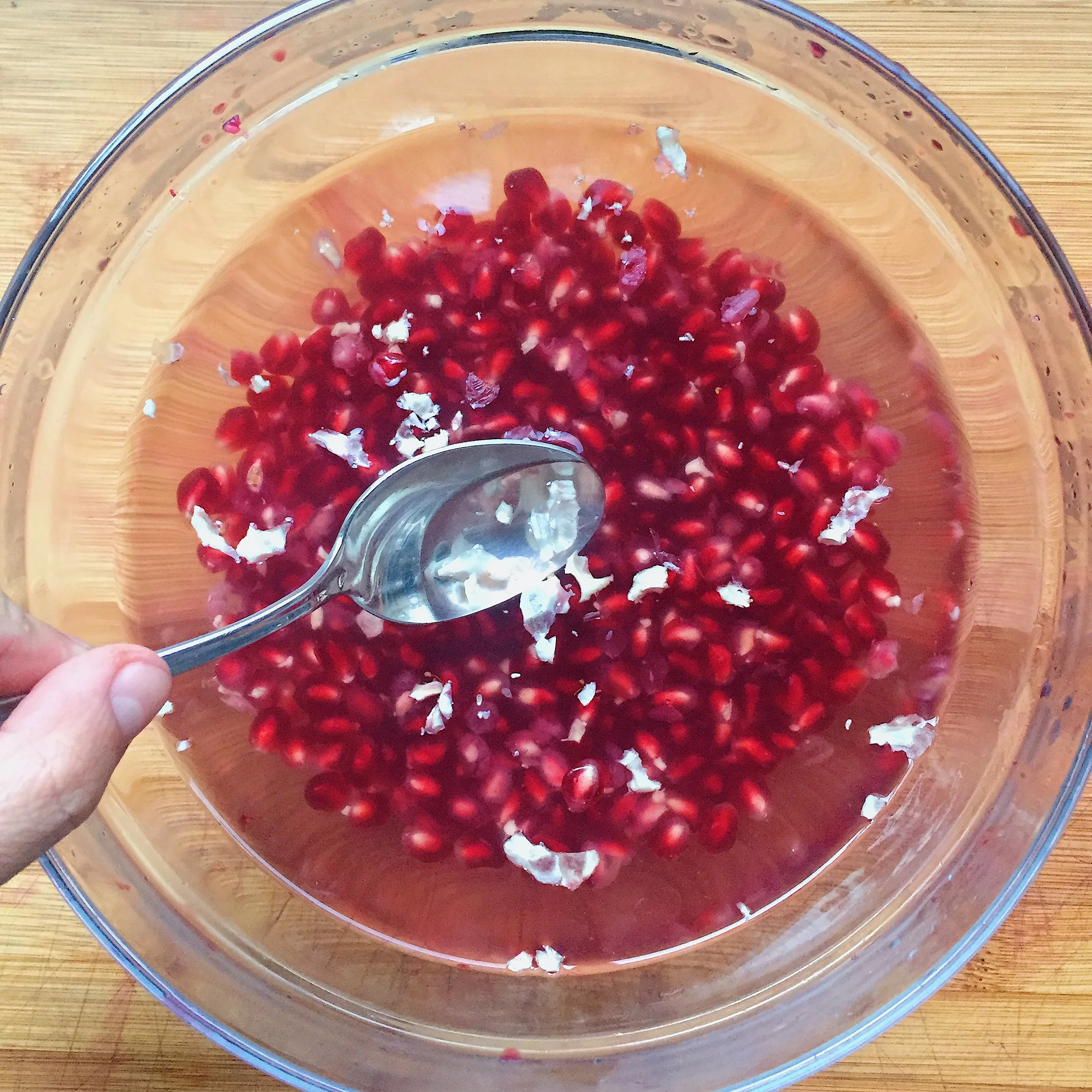 the membrane can be a sticky little bugger so even after you have removed all the seeds, there is usually some still floating around. fill your bowl of seeds with water and run your fingers through the seeds to release them from any remaining membrane. let the seeds settle and the remaining membrane will float to the top.