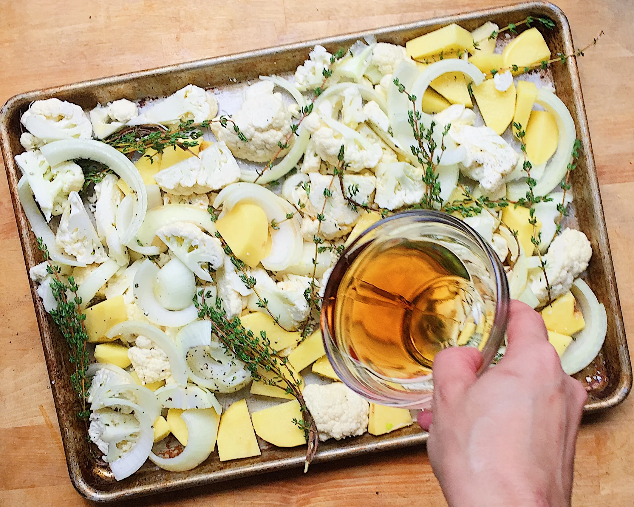 on a baking sheet. on a baking sheet, combine the cauliflower, potato, onion, garlic, and thyme. drizzle with olive oil, add the lime juice and season with half the salt and pepper.