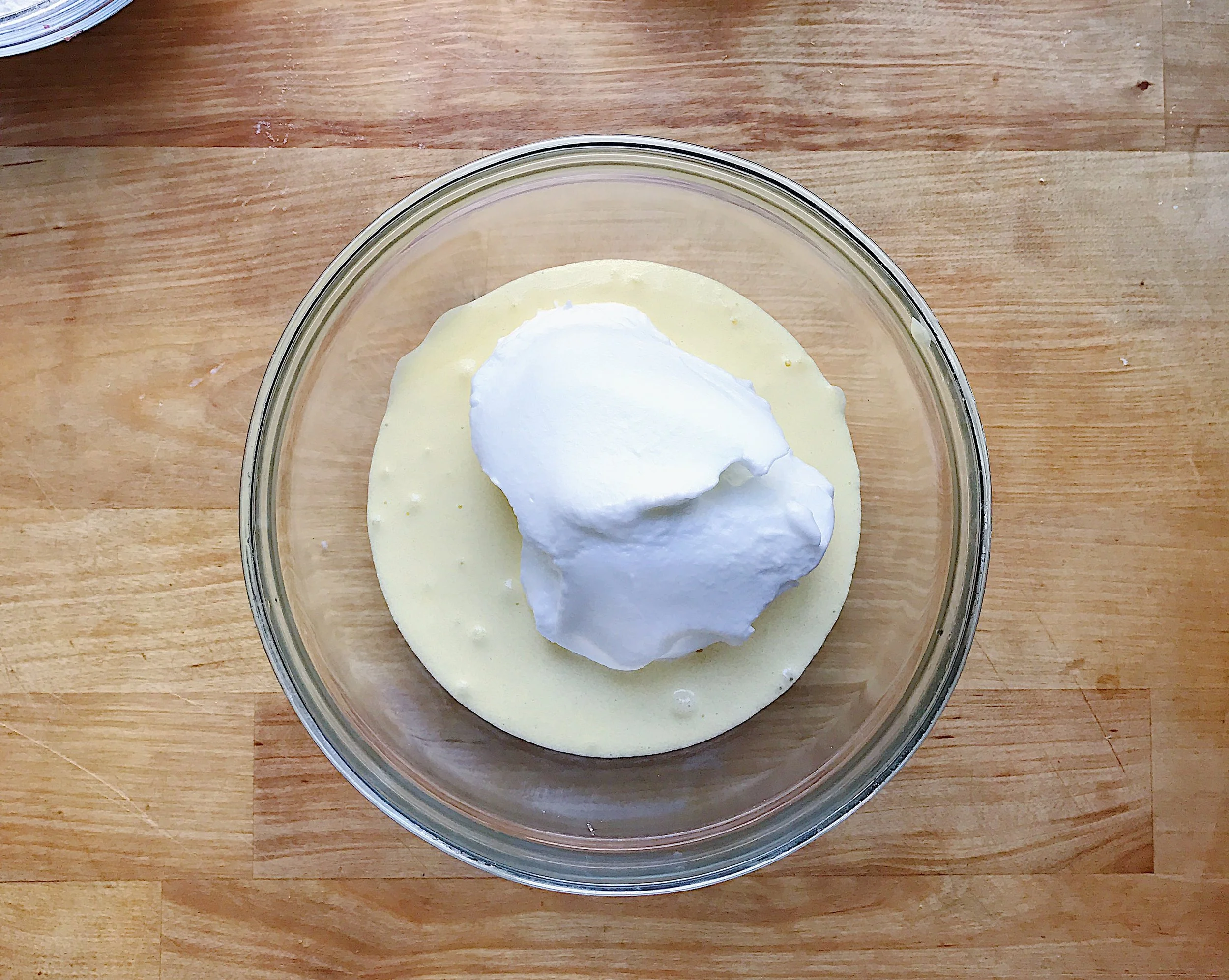 then, using your rubber spatula, fold a large scoop of the egg whites into the egg yolk mixture so it becomes light.